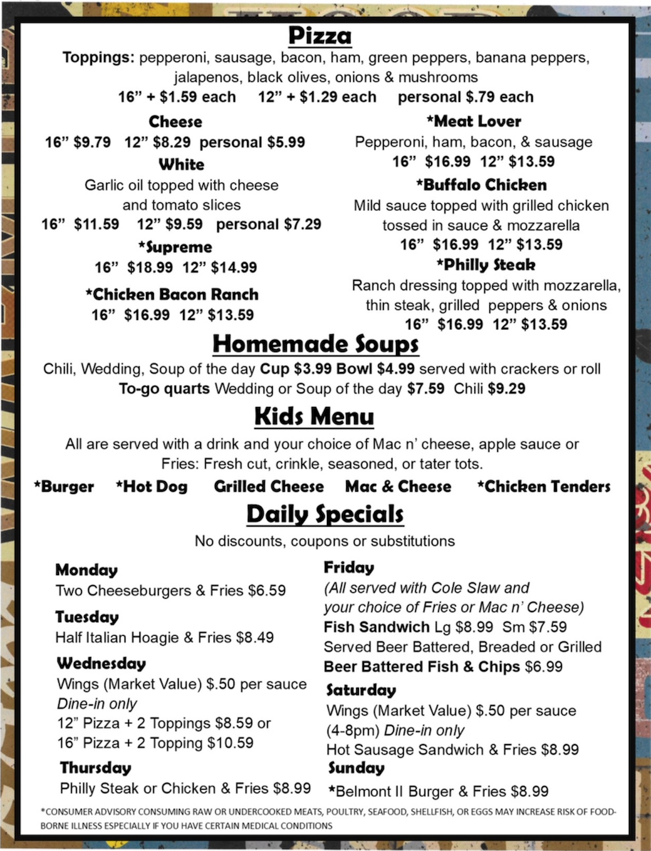 Welcome to Belmont II, a hidden gem located at 1803 N Main St, Butler, PA. This lively venue strikes a perfect balance between family-friendly dining and delicious, hearty meals. The menu showcases a wonderful selection, including mouthwatering steak salads, flavorful wings, and the notorious mushroom Swiss burger. For younger patrons, the kids menu features beloved options like Grilled Cheese and Mac & Cheese.